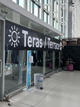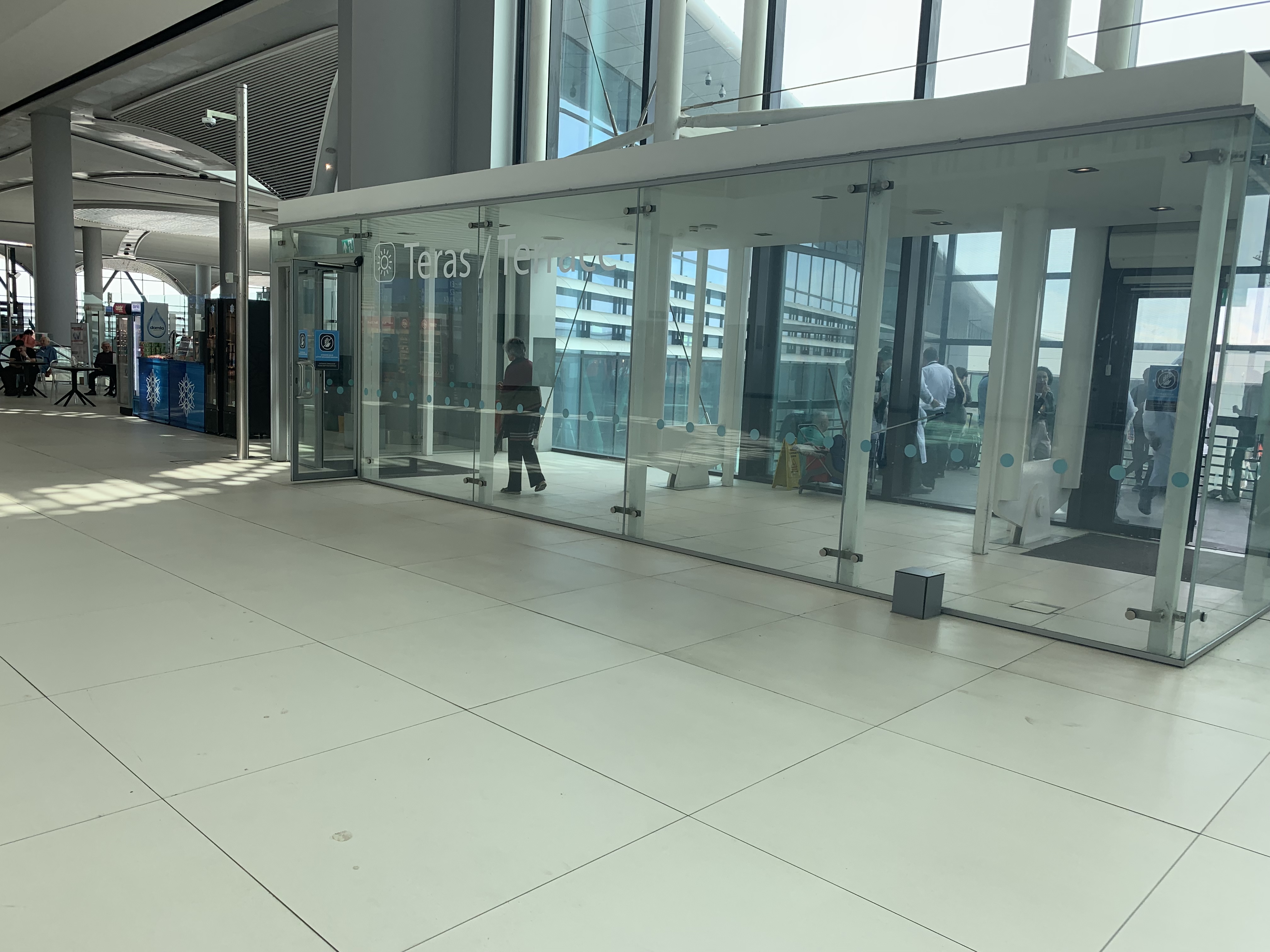 Outdoor smoking terrace located to the left of Gate E1, serving both the domestic side and international flights. Approximately 50 meters past Starbucks, opposite the tobacco shop.