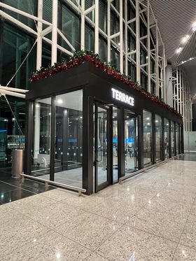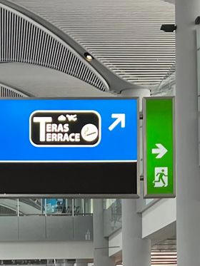 Smoking terraces in the Gate F area, located between Gates F9-F10 and between Gates F12-F13. Wing F primarily serves flights to the US and Europe. Note there may be a secondary security check before entering the gate area.