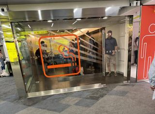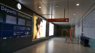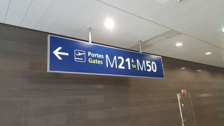 Cerca de las escaleras mecánicas del tren lanzadera, justo antes de las puertas M de la zona libre de impuestos.
