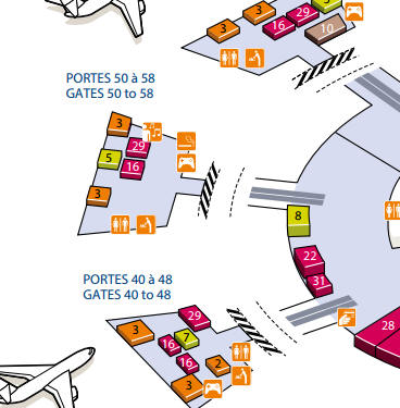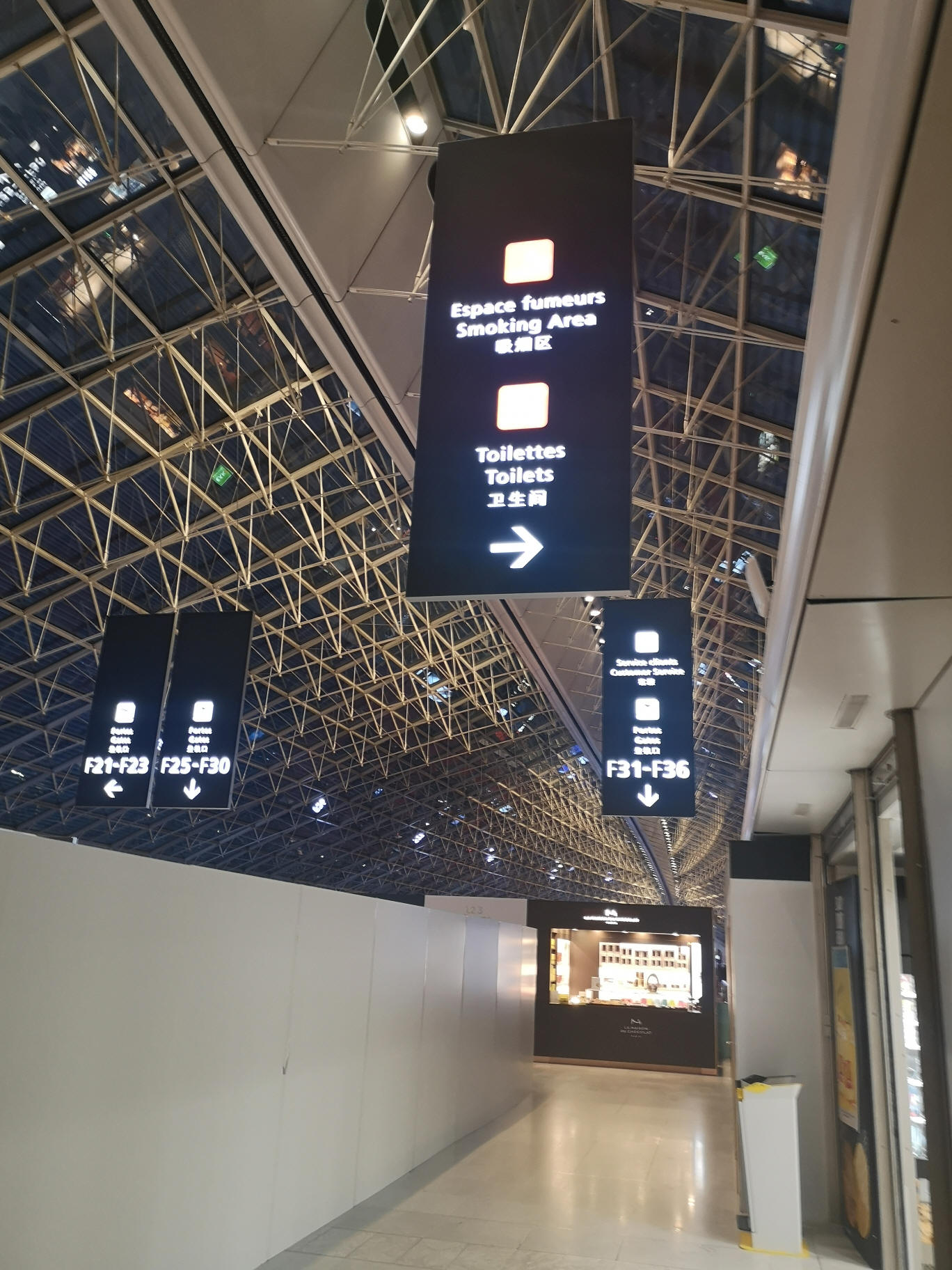 Salas de fumadores ubicadas en la planta baja cerca de las zonas de puertas F21-F26 y F31-F36. Bien señalizadas, cerca de las áreas de conexión y los baños. Una sala adicional cerca de F47-F56 está en la planta baja frente a los baños.
