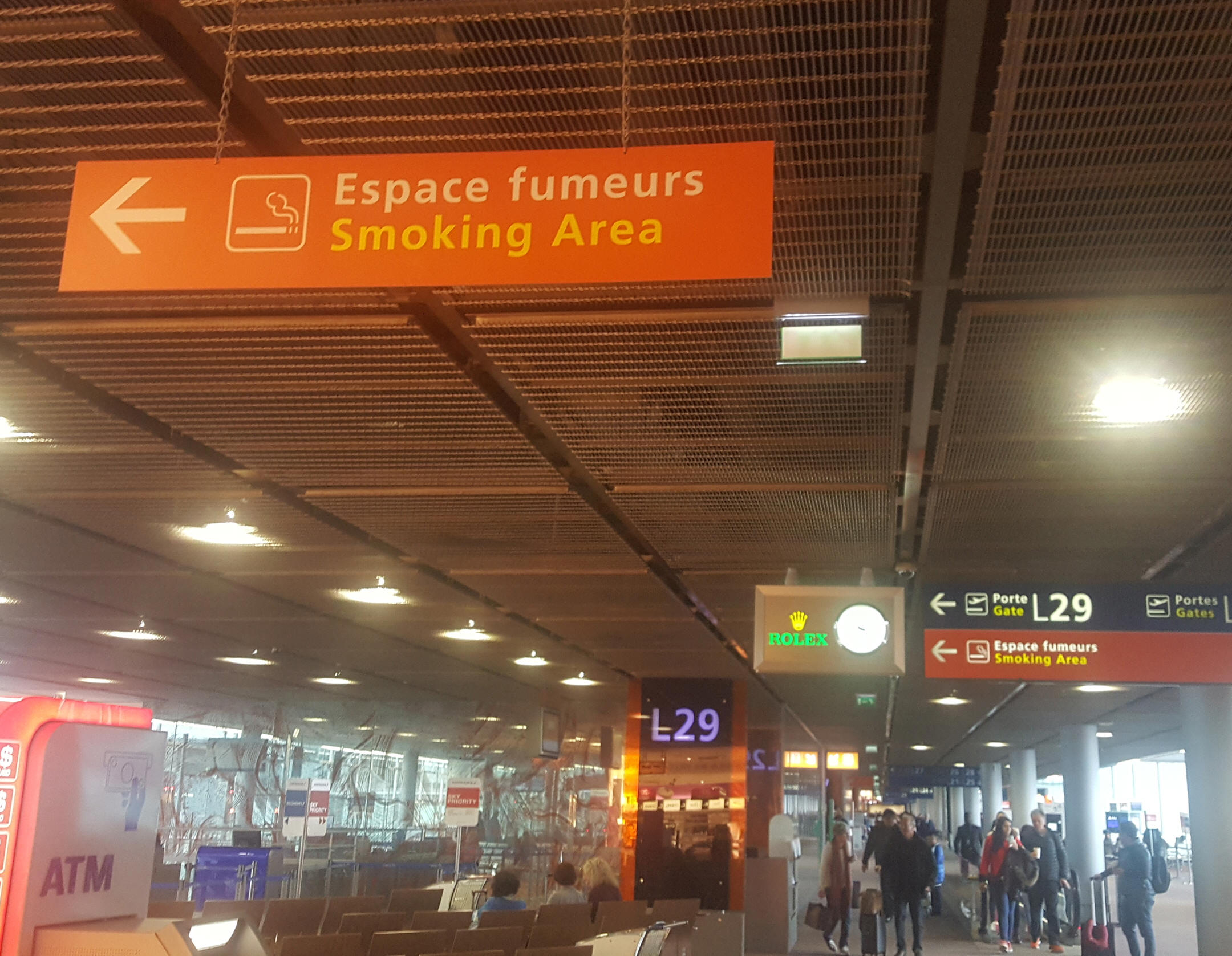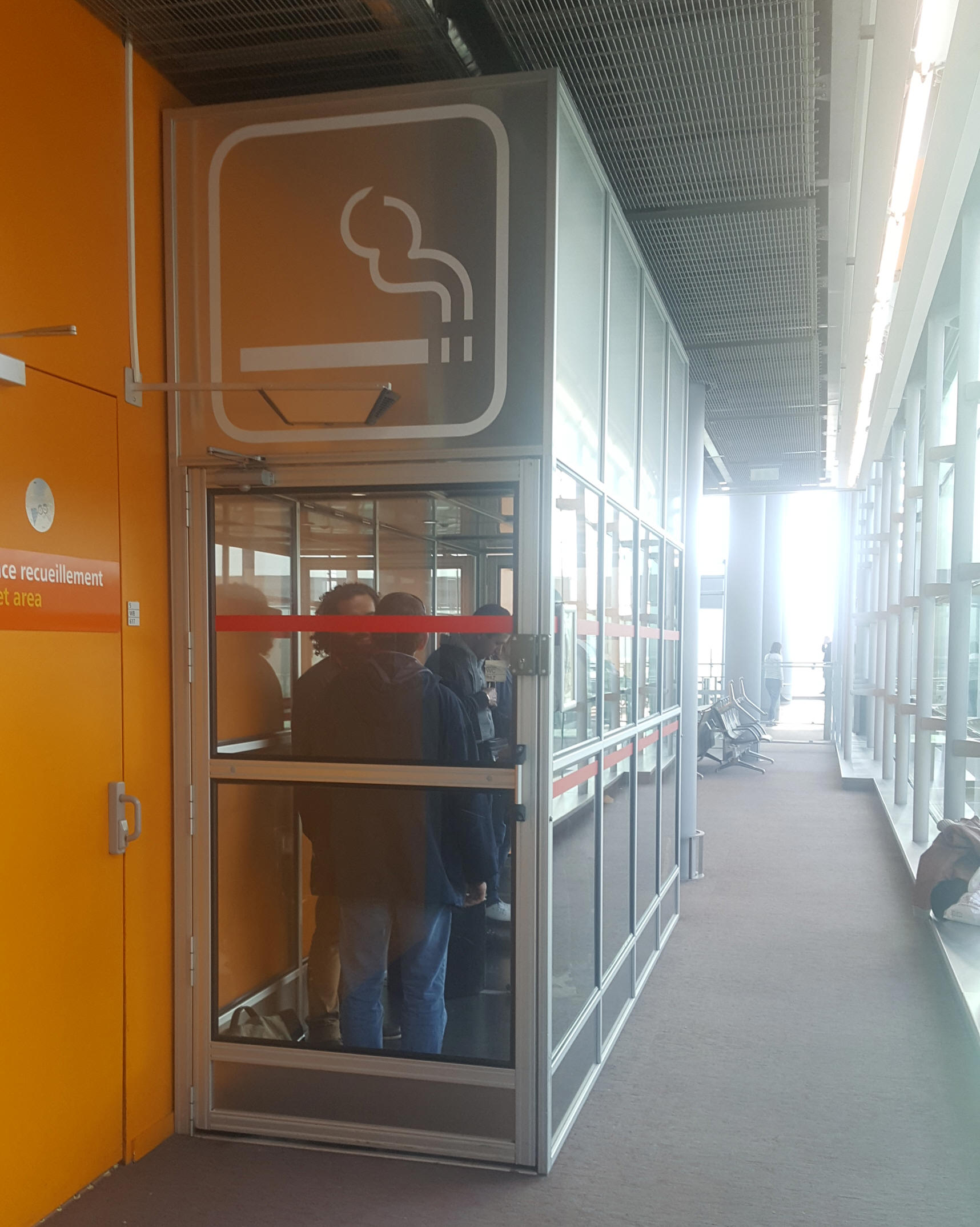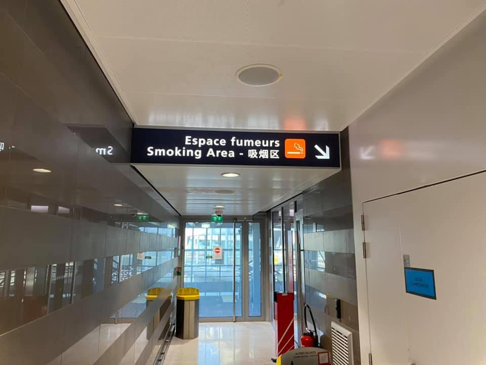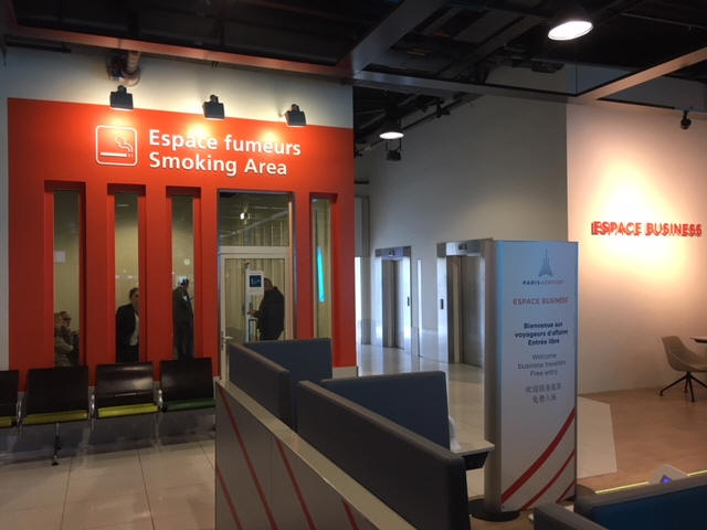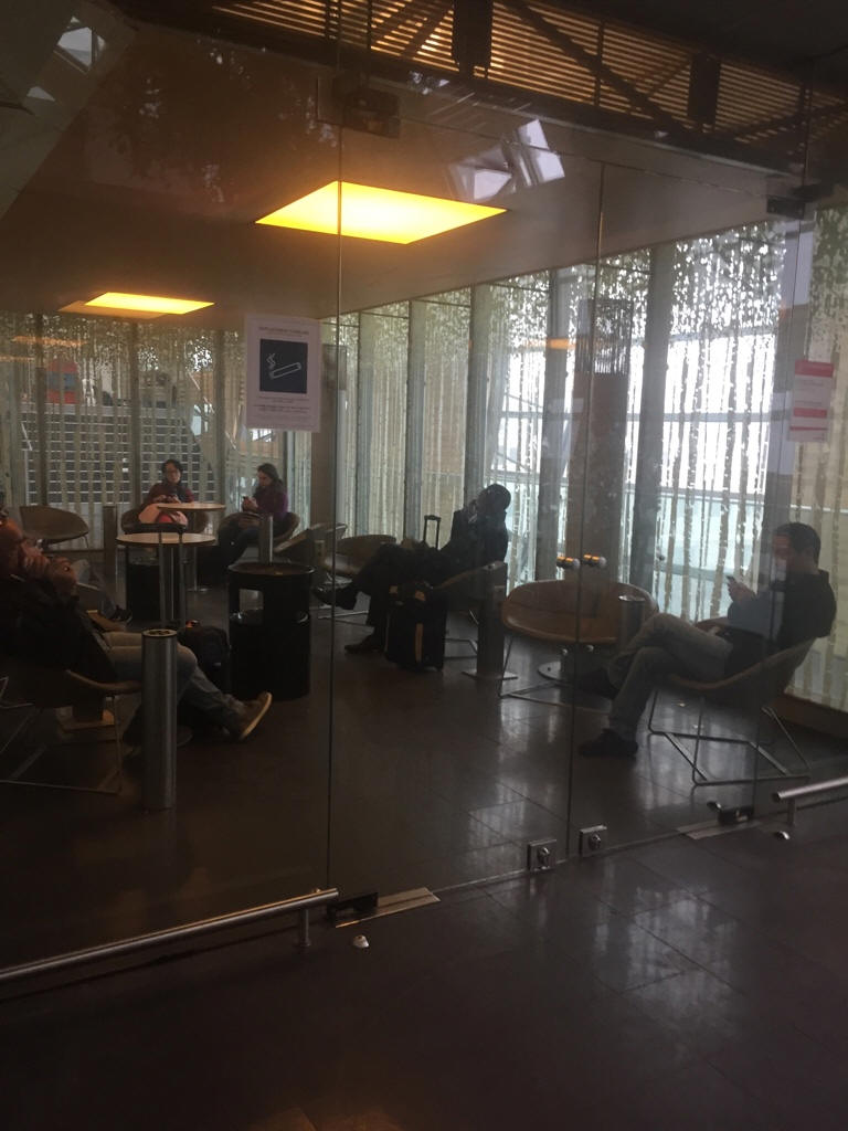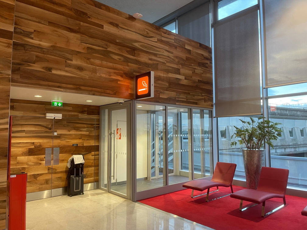 Área de fumadores en la sala de espera principal en la parte superior de las escaleras después de seguridad, en la pared del fondo cerca de Espace Business, en el extremo opuesto a la zona de puertas.