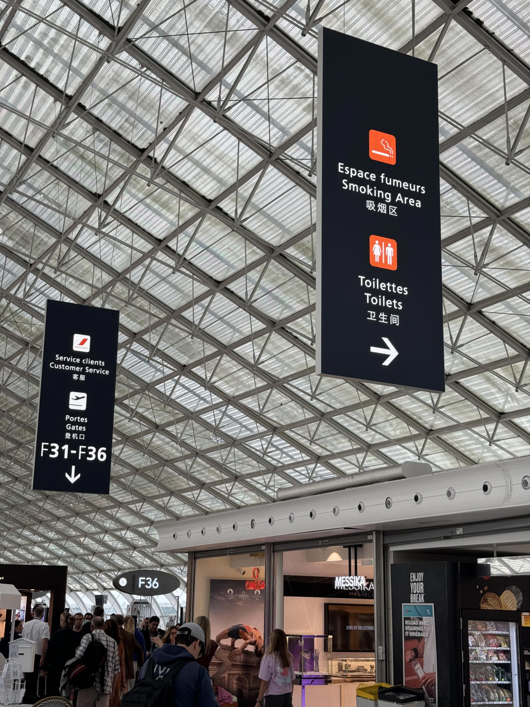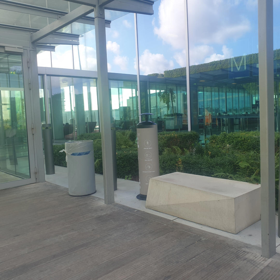 Gran área de fumadores al aire libre después de seguridad cerca de las puertas 8-15. Accesible a través del café Pret A Manger después de seguridad. Una de las áreas de fumadores más grandes de CDG.
