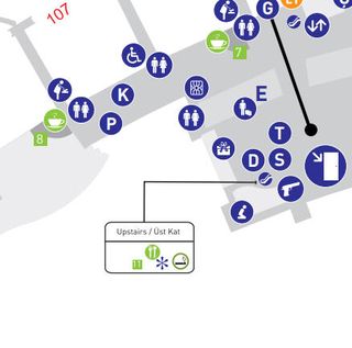 Consultez la signalétique ou les plans du terminal pour connaître l'emplacement exact. Les images suggèrent une zone accessible par l'escalier supérieur (Üst Kat).